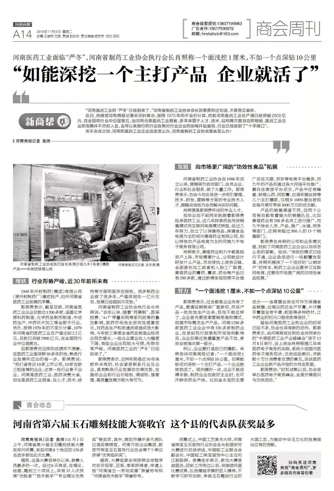他畢業后不到兩年就跟著郭榮貴投身醫藥工業,這幾年探索藥品傳統銷售模式向互聯網電商模式轉型,經過幾年努力,創立了以保健用品、保健食品電商為主的鄭州黃塔藥業有限公司,和以特色農產品電商為主的河南九牛電子商務有限公司。